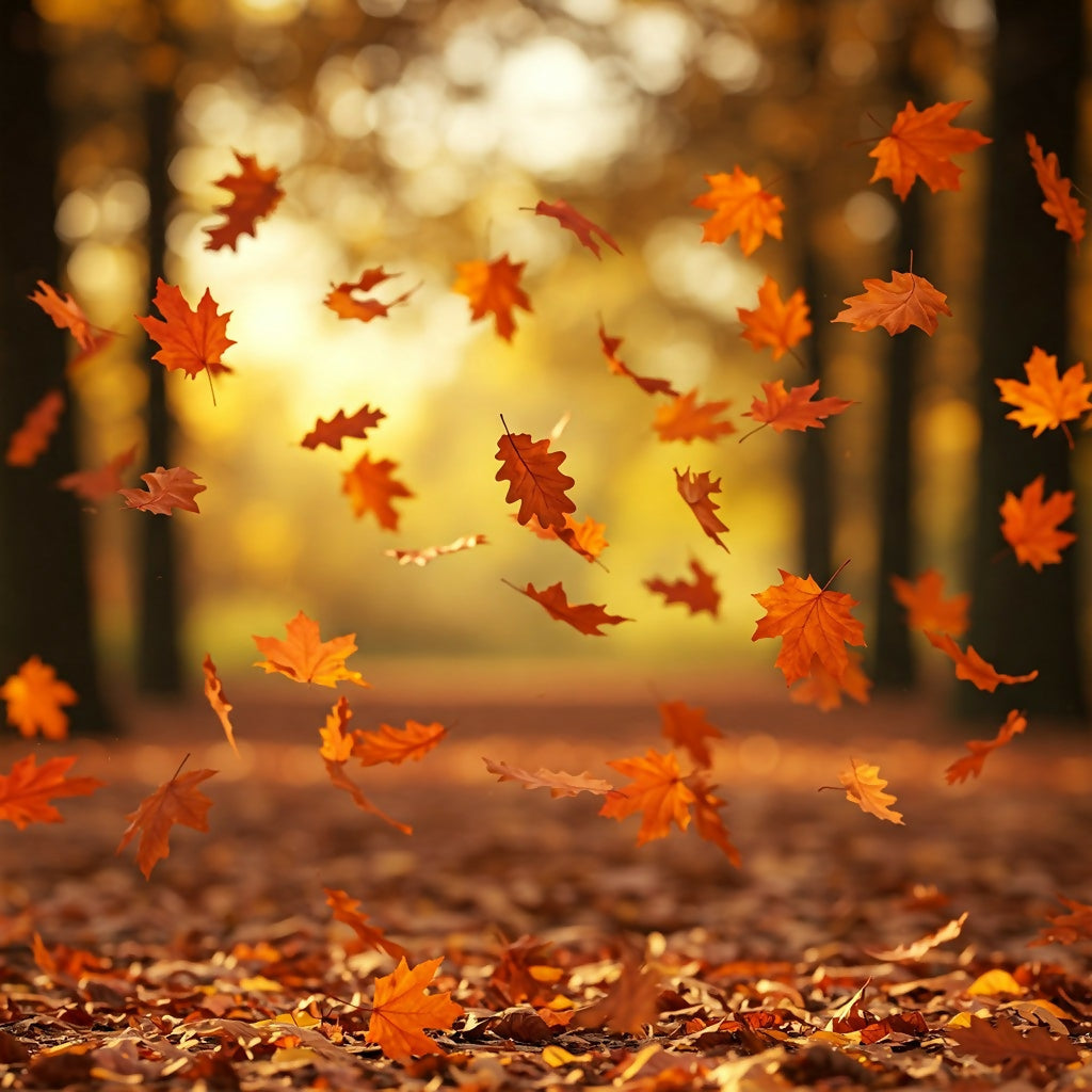 a vibrant autumnal scene with a multitude of falling, colorful leaves in various shades of orange, brown, and gold, against a background of blurred trees and a slightly out-of-focus ground covered in fallen leaves, showcasing a soft, warm light and bokeh effect, emphasizing the feeling of a gentle autumn breeze.