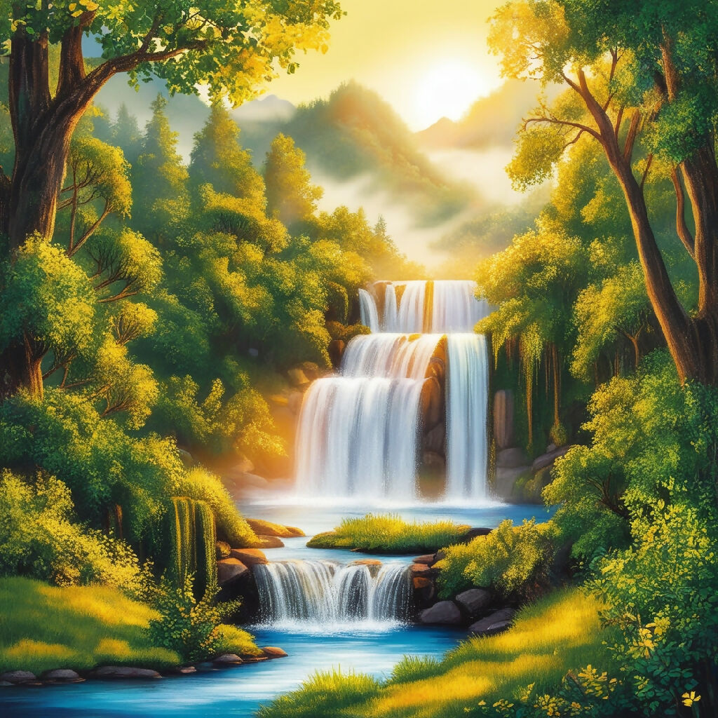 A vibrant forest landscape with a cascading waterfall, sunlit greenery, and misty mountains under a glowing sky