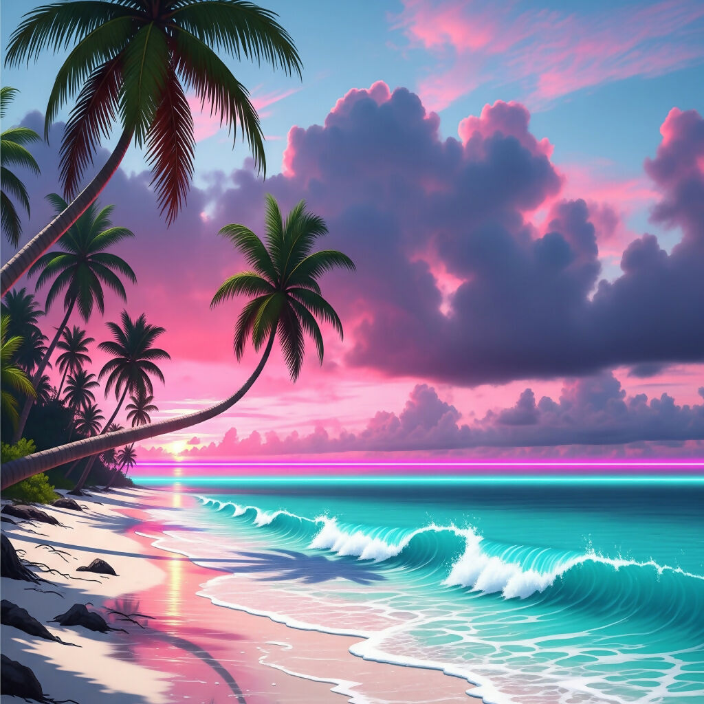 A vibrant tropical beach at sunset with swaying palm trees, colorful skies, turquoise waves, and a glowing neon horizon
