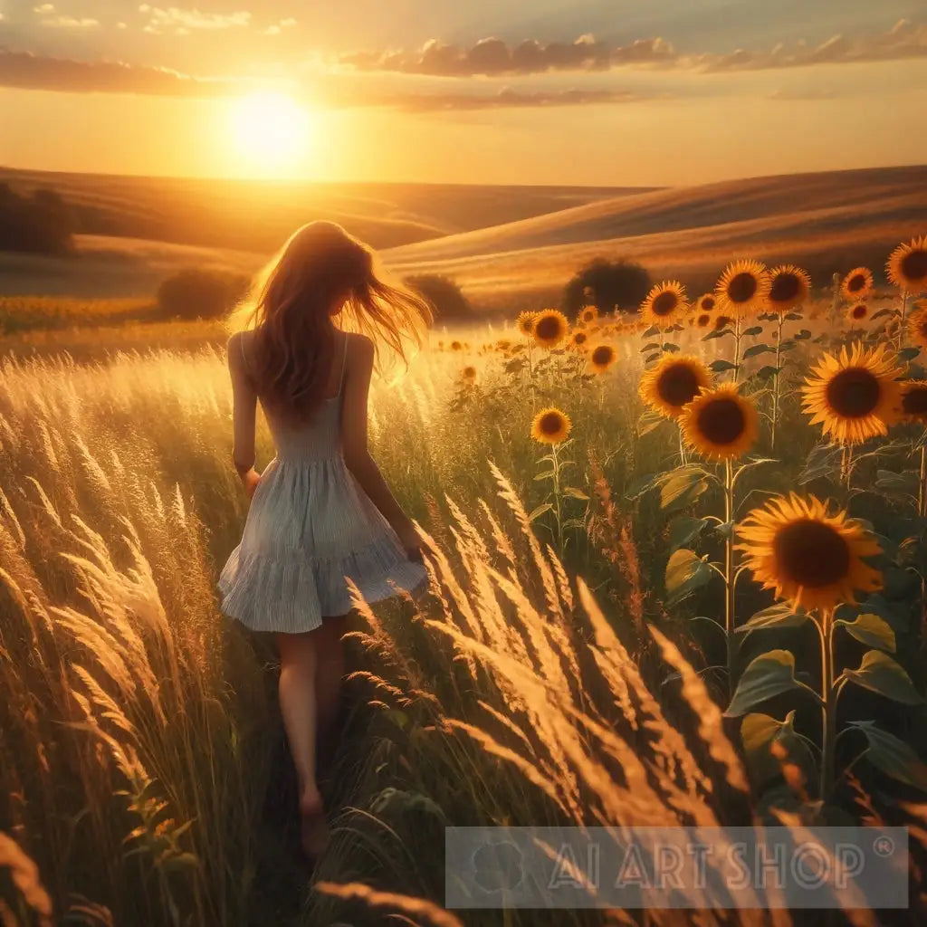 Picturesque scene of a girl walking in tall grass with sunflowers scattered throughout the field, with the sun setting low on the horizon. The setting is peaceful, with warm hues from the setting sun casting a golden glow across the landscape.