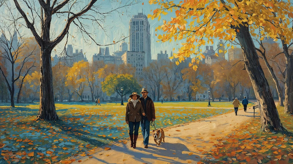A painting of a couple walking their dog in Central Park in NYC on a beautiful fall day.