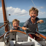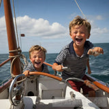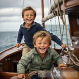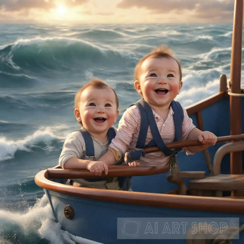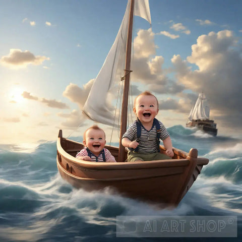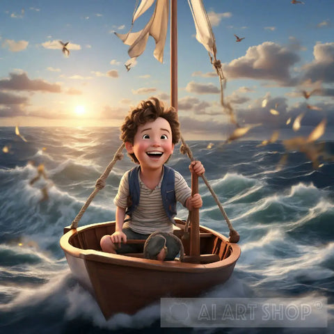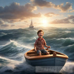 A 3D image of a baby laughing while on a sailboat while he is on the boat alone with the waves