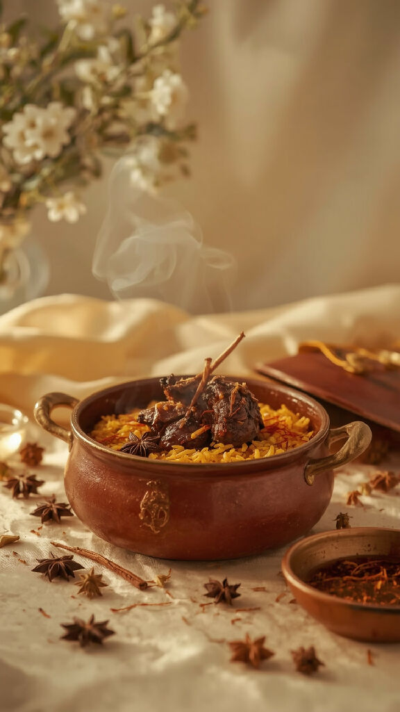 A warm and inviting professional food photography setup featuring Dum Pukht