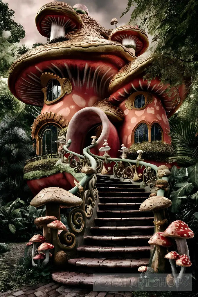 A whimsical and enchanting scene of a fantastical mushroom-shaped house, seamlessly integrated into a lush green forest. The vibrant house, adorned with gold accents and ornate patterns, creates a striking contrast with the surrounding foliage. The large, curved entrance is inviting, while the unique spiral staircase, decorated with mushroom sculptures and other fantastical creatures, leads to a magical world above. The overcast sky adds a touch of mystique, making this house a true fairy-tale dwelling.