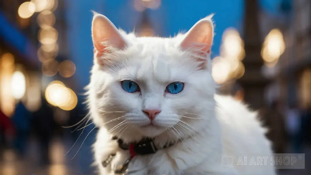 a white cat with blue eyes in Paris bokeh background unreal engine