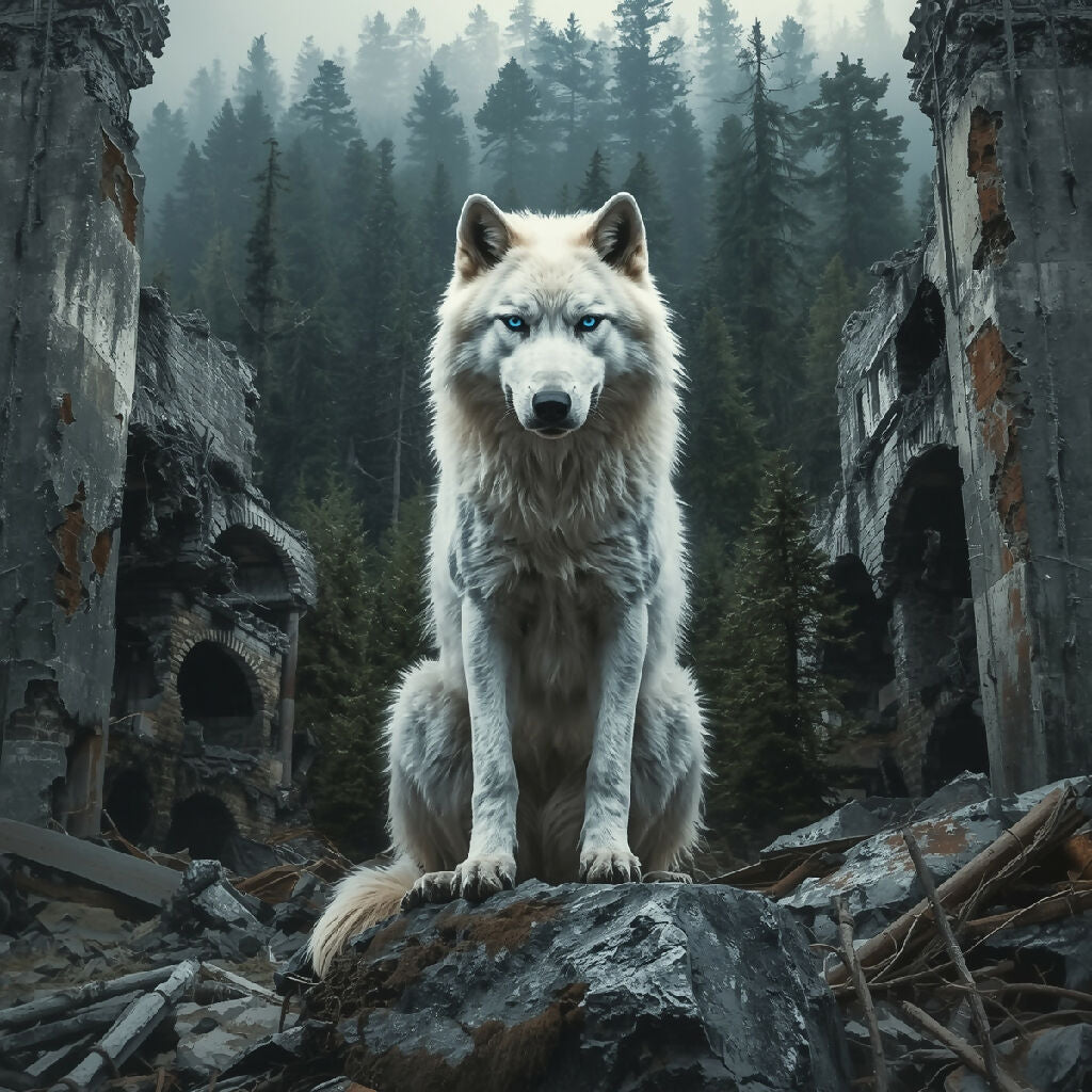 A white wolf with piercing blue eyes sits atop a weathered stone