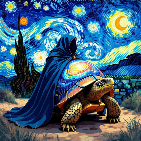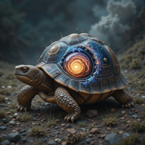A wise tortoise with a shell that shows an entire swirling galaxy inside it