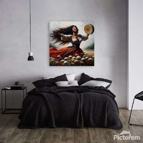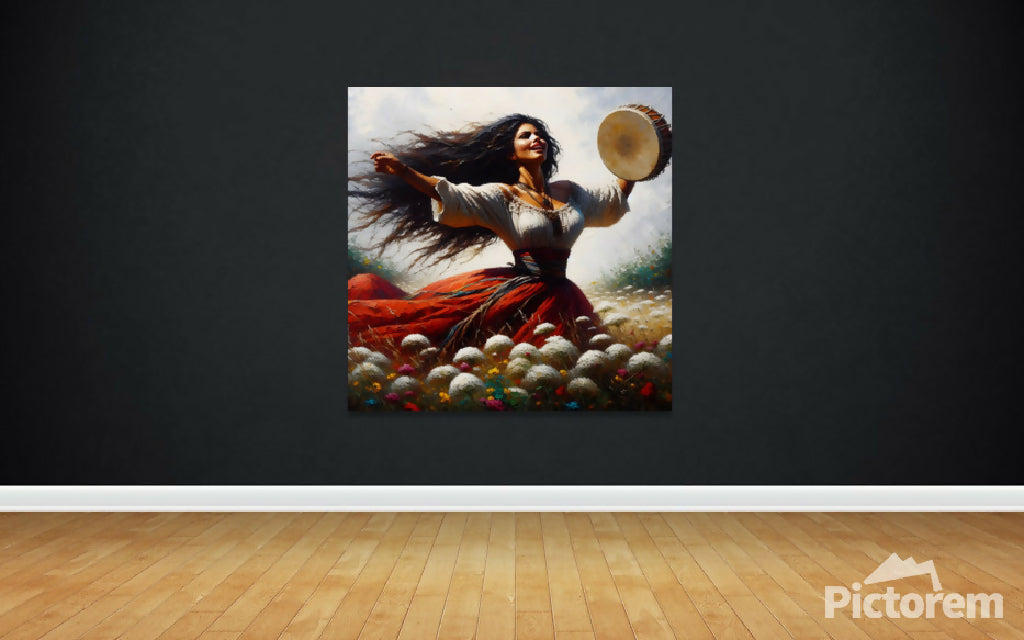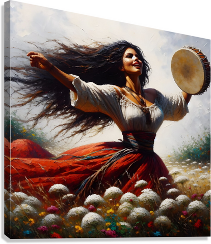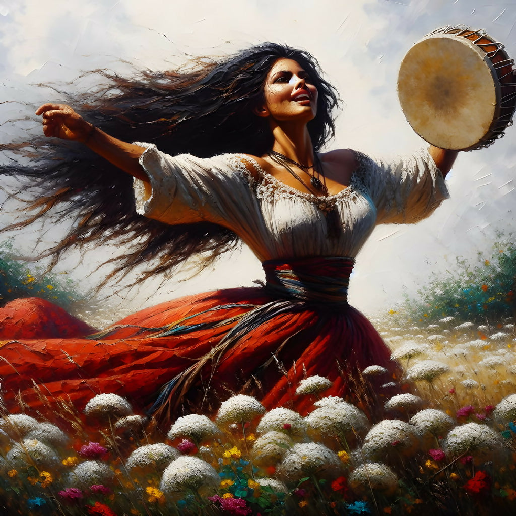 This image shows a Hispanic woman dancing in a field of wildflowers, her red dress twirling and her long black hair flowing. Created in a rough brushwork style, the painting captures intricate details and a sense of depth