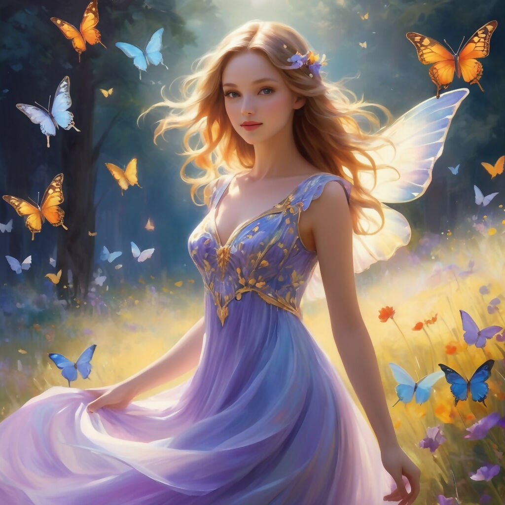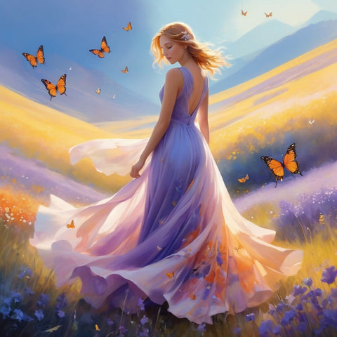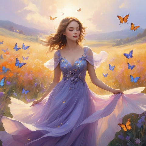 *A dreamy watercolor painting of a woman standing in a lush, sunlit meadow, surrounded by a mesmerizing swirl of colorful butterflies. Her flowing dress, painted in soft pastels of lavender and sky blue, billows gently in the breeze. Sunlight filters through the air, casting a golden glow on the scene, blending warm yellows and soft pinks into the background.