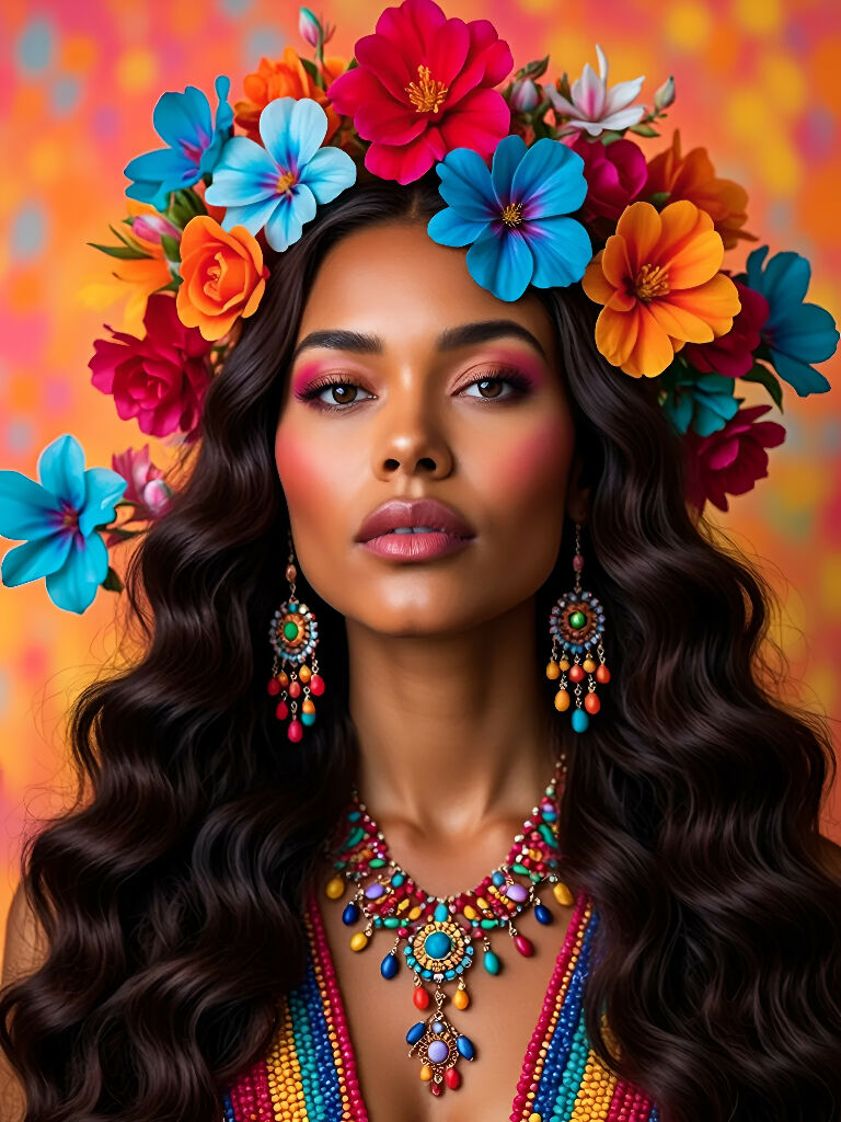 A woman with long dark hair and a bright smile, adorned with a vibrant floral crown on her head, wearing colorful jewelry including earrings and necklace. She is set against a backdrop of a multicolored pattern that adds to the lively atmosphere of the image.