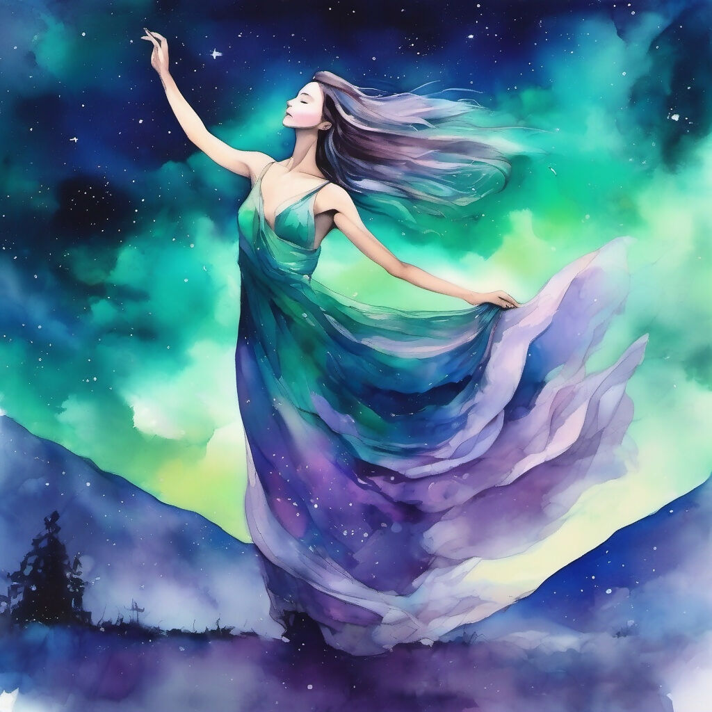 "A breathtaking watercolor painting of a graceful woman dancing beneath a vast, starry sky illuminated by swirling aurora lights. Her flowing gown, painted in delicate washes of deep sapphire blue, soft lavender, and shimmering silver, billows around her as she moves with effortless elegance. The fabric catches the ethereal glow of the aurora, blending seamlessly with the night’s luminous hues.