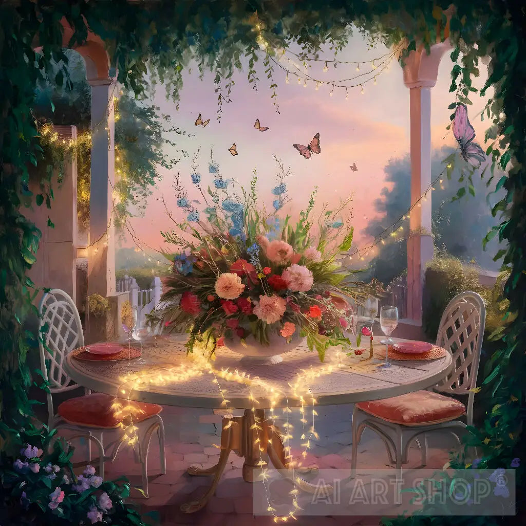 A wonderful painting shows a round table with a wonderful design and chairs, and on it is a bouquet of roses and flowers of exquisite colors and sizes, with a group of beautiful butterflies flying around it, surrounded by wonderful green leaves, and from the background you can see the beautiful red sky.