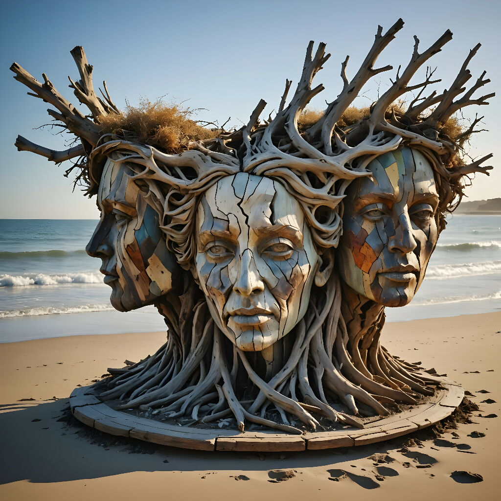A beautifully crafted wooden statue featuring the heads of three majestic sea goddesses. The carving captures their serene yet powerful expressions, with flowing details evoking the ocean'swaves and marine elements. The statue stands gracefully on the sandy beach, weathered to a soft patina by sea breeze and salt air, symbolizing mystical guardians of the sea and embodyingthe timeless connection between the ocean and divine feminine energy.