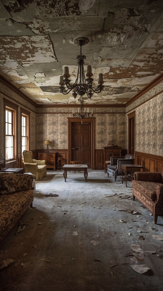 A worn, vintage house with peeling wallpaper and faded carpet, in dire need of interior renovation, with old furniture and dusty chandeliers, showcasing a lived-in yet neglected atmosphere, featuring a blend of natural and artificial lighting, with a color palette of muted browns, grays, and yellows, and a mix of patterns and textures from the outdated furnishings and decor, set against a backdrop of cracked walls and creaky wooden floors, with an overall sense of nostalgia and potential for transformation.