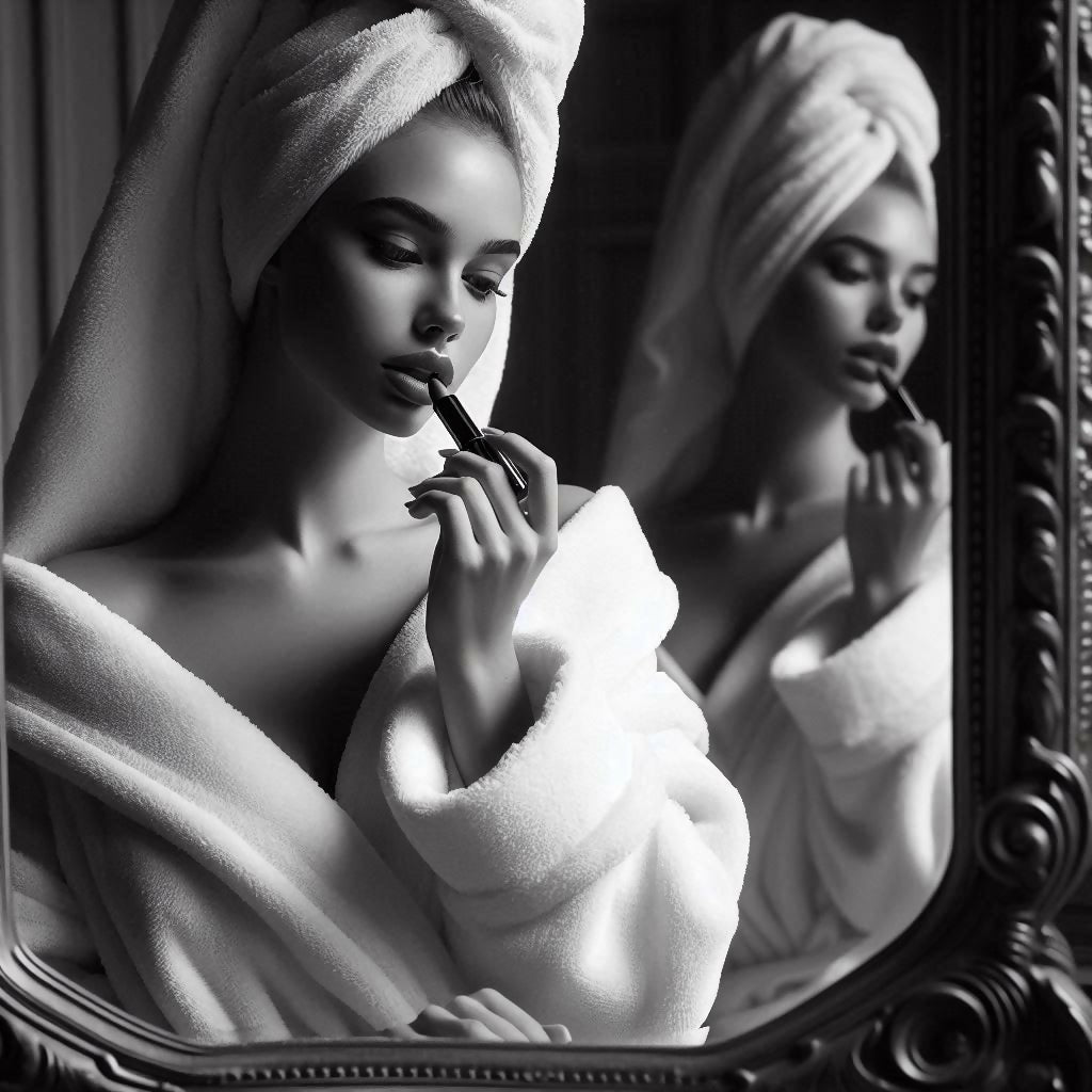 A young, beautiful woman in a plush white bathrobe with a towel wrapped around her head stands in front of a large, ornate mirror. She is in the process of applying makeup, holding a sleek lipstick in her hand. The scene is captured in high-quality black and white, highlighting the contrast between the soft textures of the bathrobe and towel, and the smooth, reflective surface of the mirror. The lighting is soft and diffused, casting gentle shadows that accentuate her delicate features and the serene, intimate atmosphere of the moment.