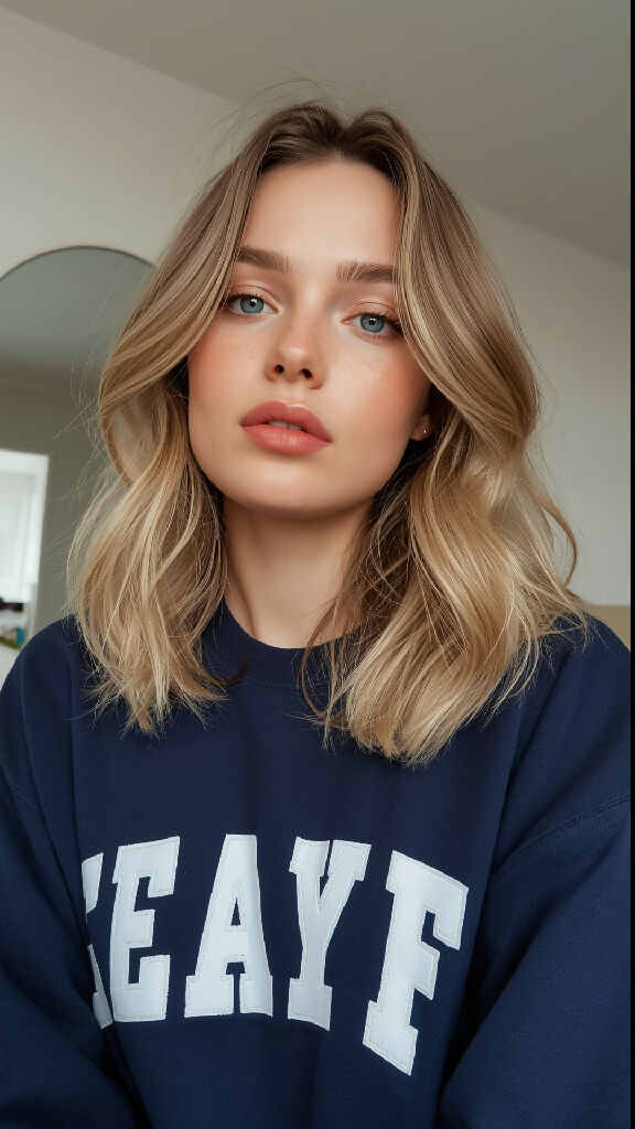 "A young woman with wavy, shoulder-length blonde hair and natural makeup posing indoors. She has clear skin with light freckles, glossy pink lips, and soft eyeliner. She's wearing a navy blue sweatshirt with white lettering. The background shows a minimalistic, softly lit room with light-colored walls and a mirror. The overall vibe is casual, fresh, and modern