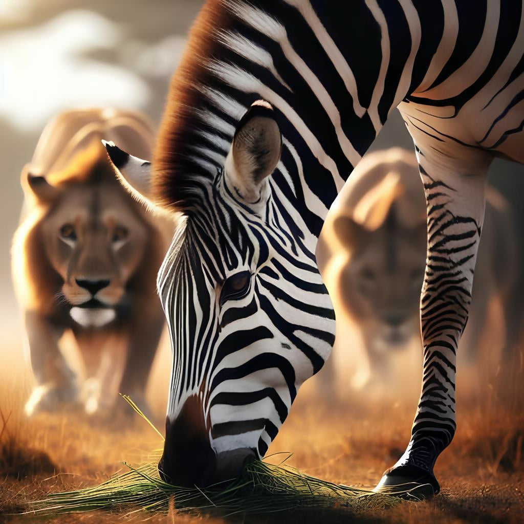 An artistic depiction of a zebra standing alert as a lion watches from the shadows. The tension of predator and prey is captured in striking detail, blending wildlife beauty with dramatic storytelling through bold colors and contrast.