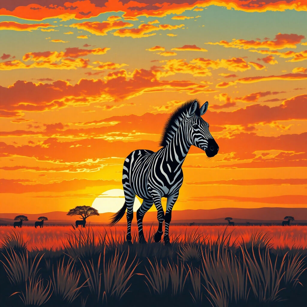 This breathtaking image captures a lone zebra standing gracefully in the vast African savanna as the sun dips below the horizon, bathing the landscape in warm golden hues. The zebra’s distinctive black-and-white stripes stand out against the soft, glowing colors of the sunset, creating a striking contrast that highlights its unique beauty. The endless expanse of the savanna and the serene atmosphere evoke a sense of solitude and timelessness, celebrating the raw elegance and harmony of nature’s design.
