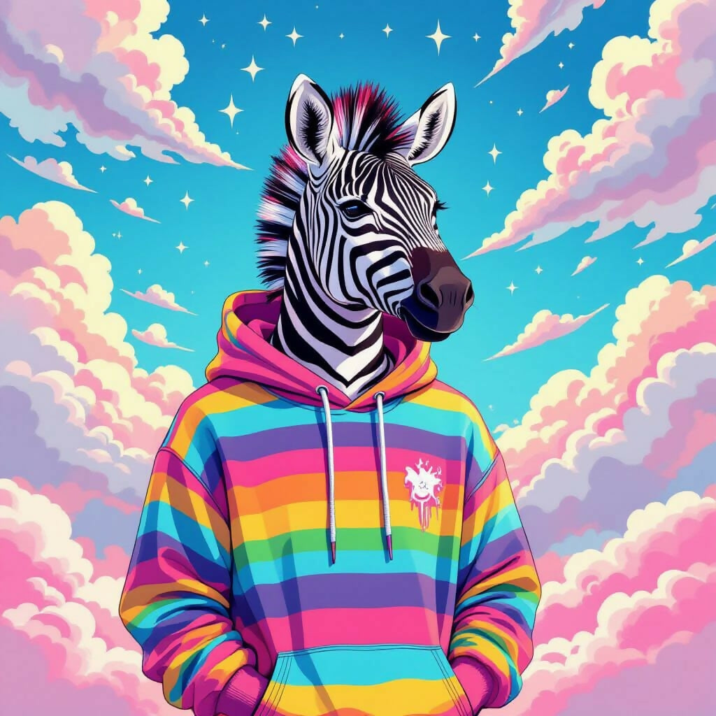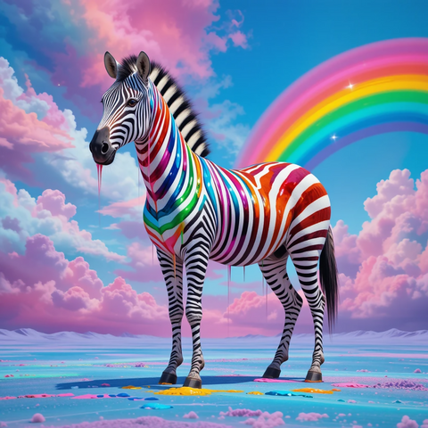 A zebra with abstract, dripping rainbow stripes standing under a surreal candy sky