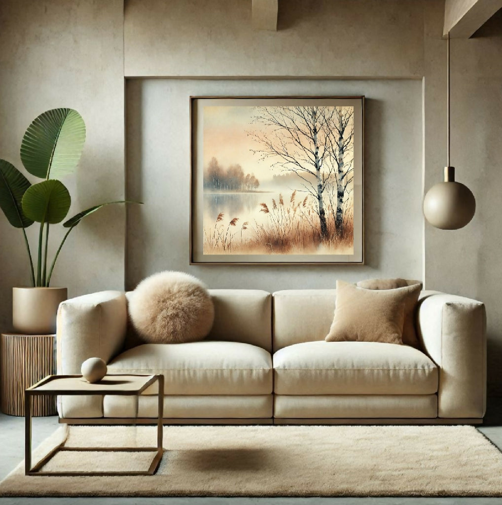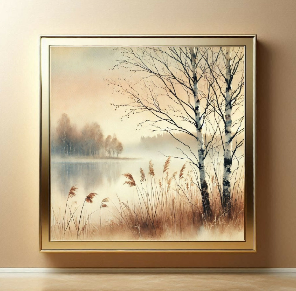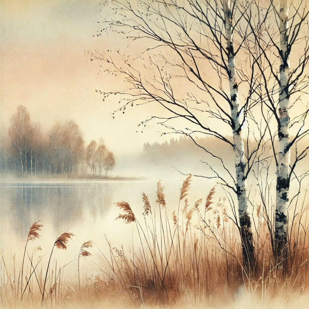Eine ruhige, neblige Szene am Ufer eines Sees. Zwei Birken stehen im Vordergrund und ragen in den Abendhimmel, der in sanften Pastelltönen gehalten ist. Im Hintergrund befinden sich weitere Bäume und der See spiegelt den Himmel wider. Im Vordergrund sind hohe Gräser oder Schilf zu sehen. Das gesamte Bild ist in weichen, aquarellartigen Farben gehalten, die ein Gefühl von Ruhe und Frieden vermitteln.