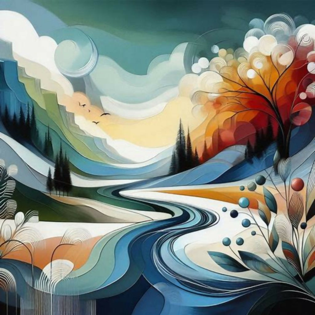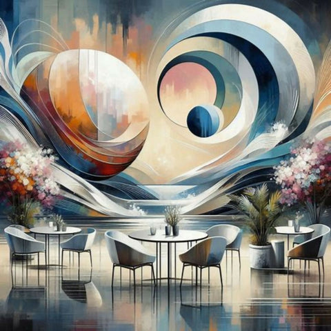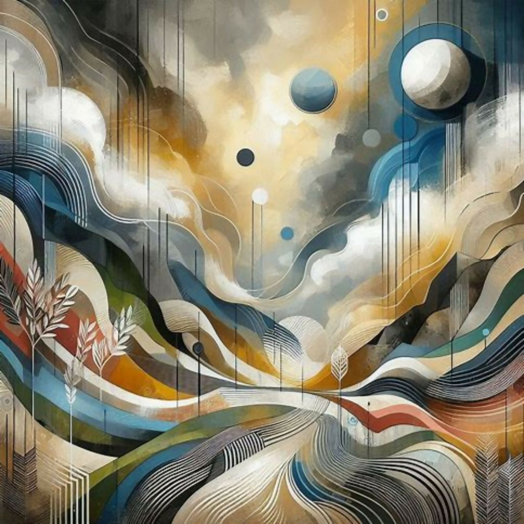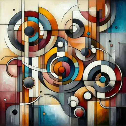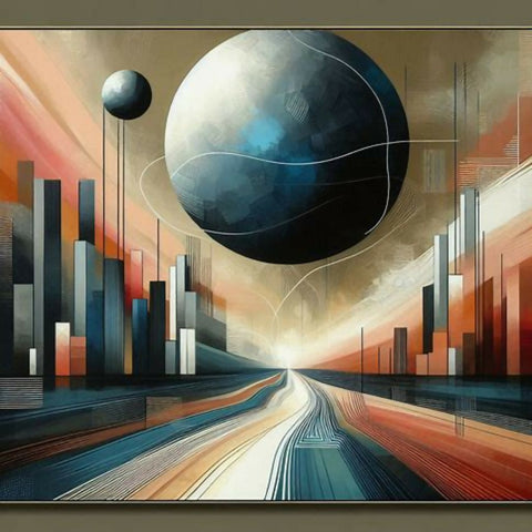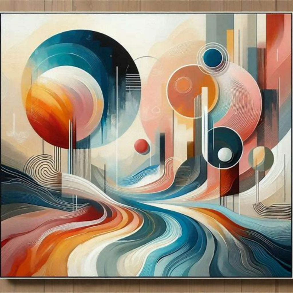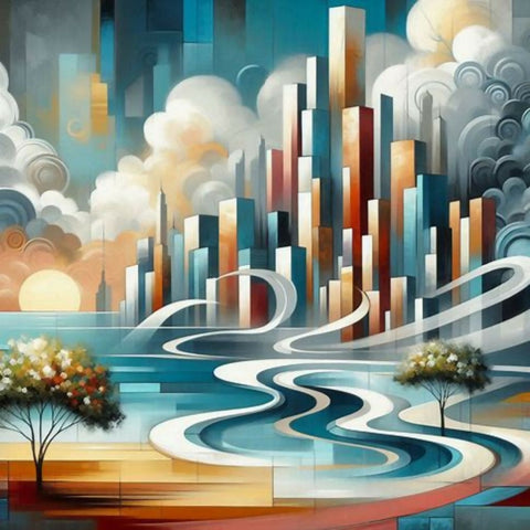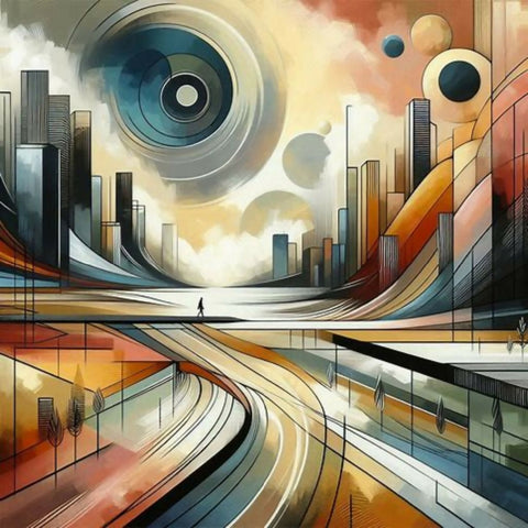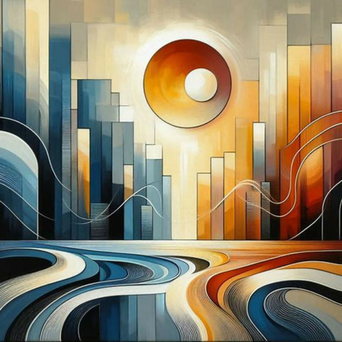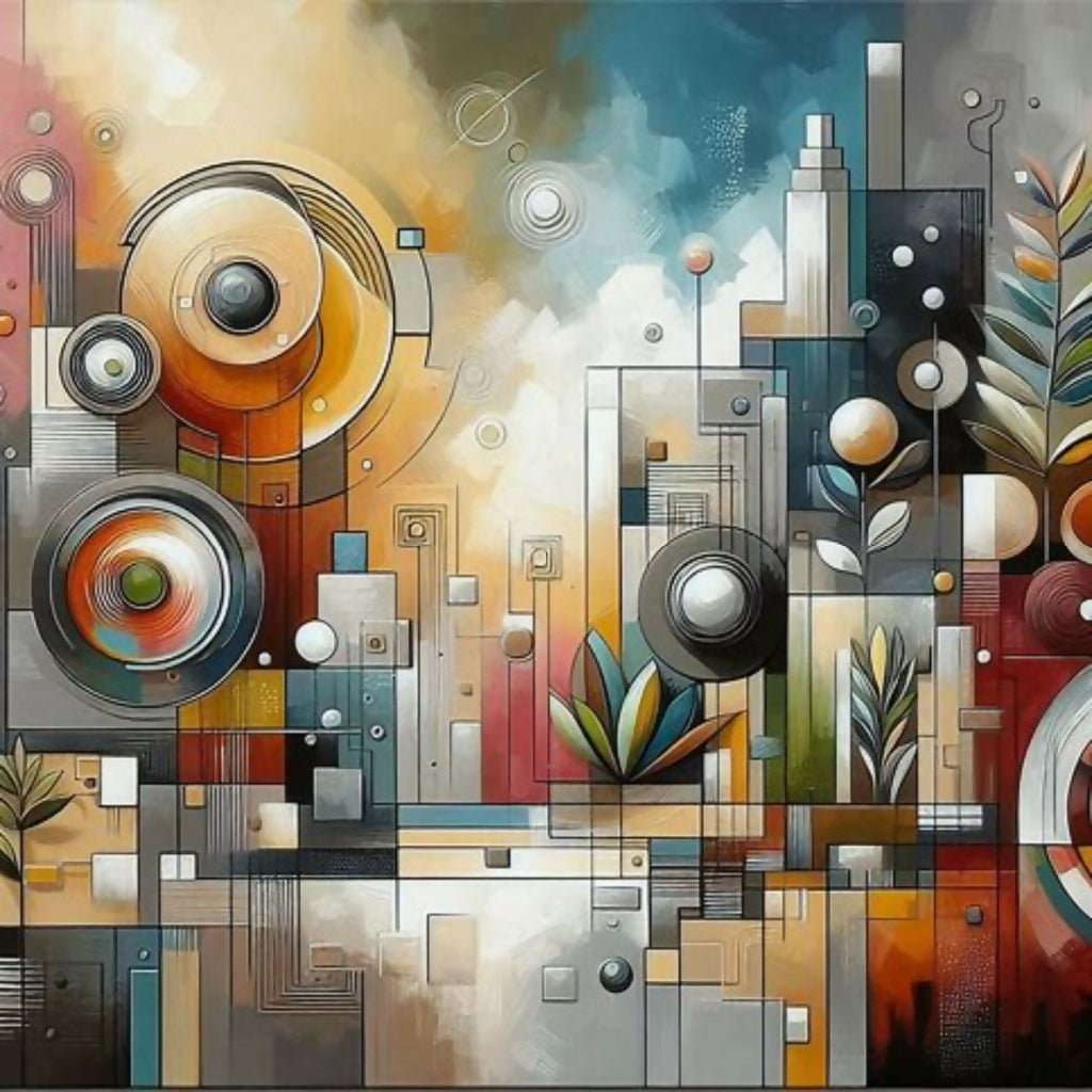abstract composition featuring a fusion of geometric and organic elements. The canvas is divided into a grid-like structure with intersecting lines, creating a sense of depth and perspective. Prominent circular forms, resembling celestial bodies or mechanical gears, dominate the scene with bold colors like orange, red, and blue, accented by concentric patterns. Stylized plants with elongated leaves in shades of green and blue add a natural contrast to the industrial aesthetic. The background blends soft, cloud-like textures with a mix of warm and cool tones, creating a dynamic, futuristic cityscape that balances structure and fluidity.
