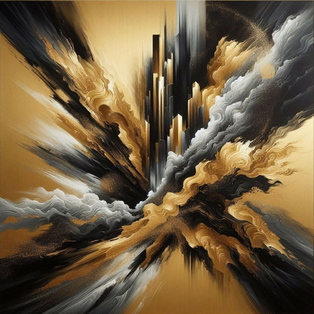 An impressive abstract painting that comes in an elegant gold and black design. The combination of these two colors creates a powerful yet luxurious atmosphere.