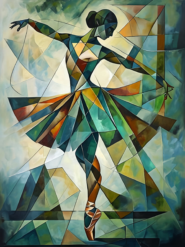 Embrace the beauty of movement and form with this stunning Abstract Ballerina Digital Art. This one-of-a-kind digital download captures the elegance of a dancer in a vibrant, geometric cubism style. The ballerina, poised en pointe, is a mesmerizing mosaic of colors, lines, and shapes that beautifully convey the flow and grace of ballet.