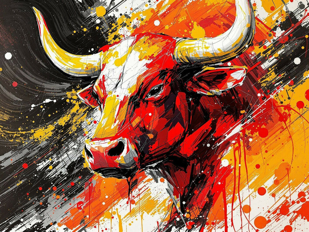 Let yourself be carried away by the fury and vitality of this abstract bull. The flamboyant colors and splashes of paint express all the power of this mythical creature. This digital artwork is a celebration of brute force and creative expression.