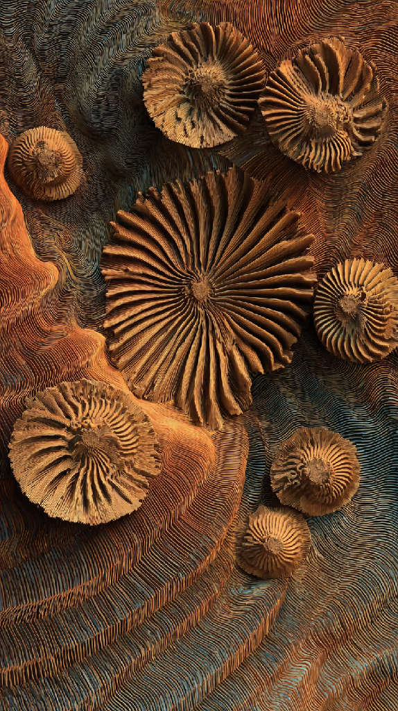 Tags: abstract, organic, concentric, textured, paper art, geological, coral-like, erosion, spiral, handcrafted, biomimicry, earthy tones, quilling, natural patterns