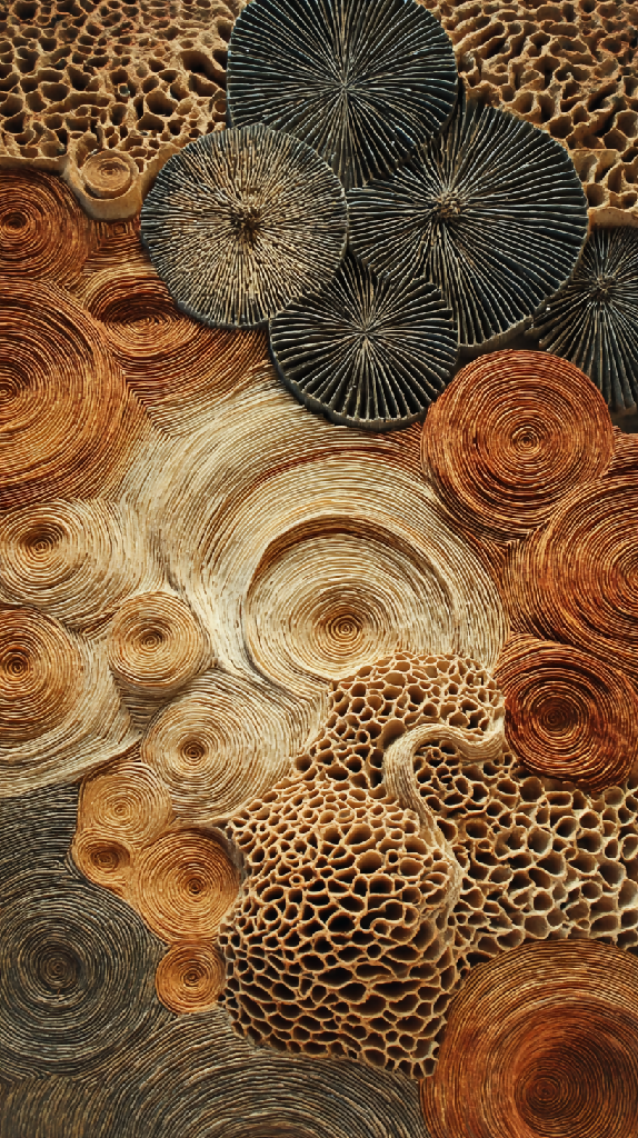 Tags: abstract, organic, concentric, textured, paper art, geological, coral-like, erosion, spiral, handcrafted, biomimicry, earthy tones, quilling, natural patterns