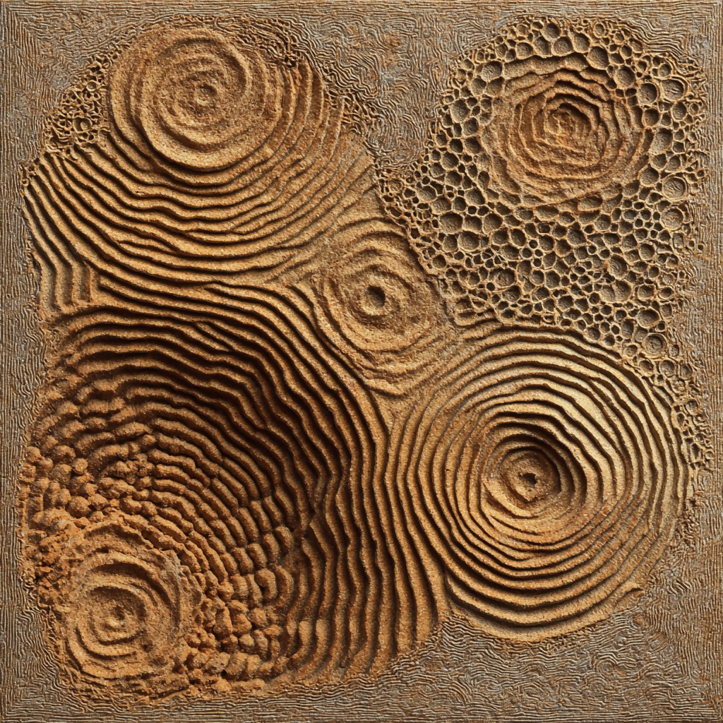 Tags: abstract, organic, concentric, textured, paper art, geological, coral-like, erosion, spiral, handcrafted, biomimicry, earthy tones, quilling, natural patterns