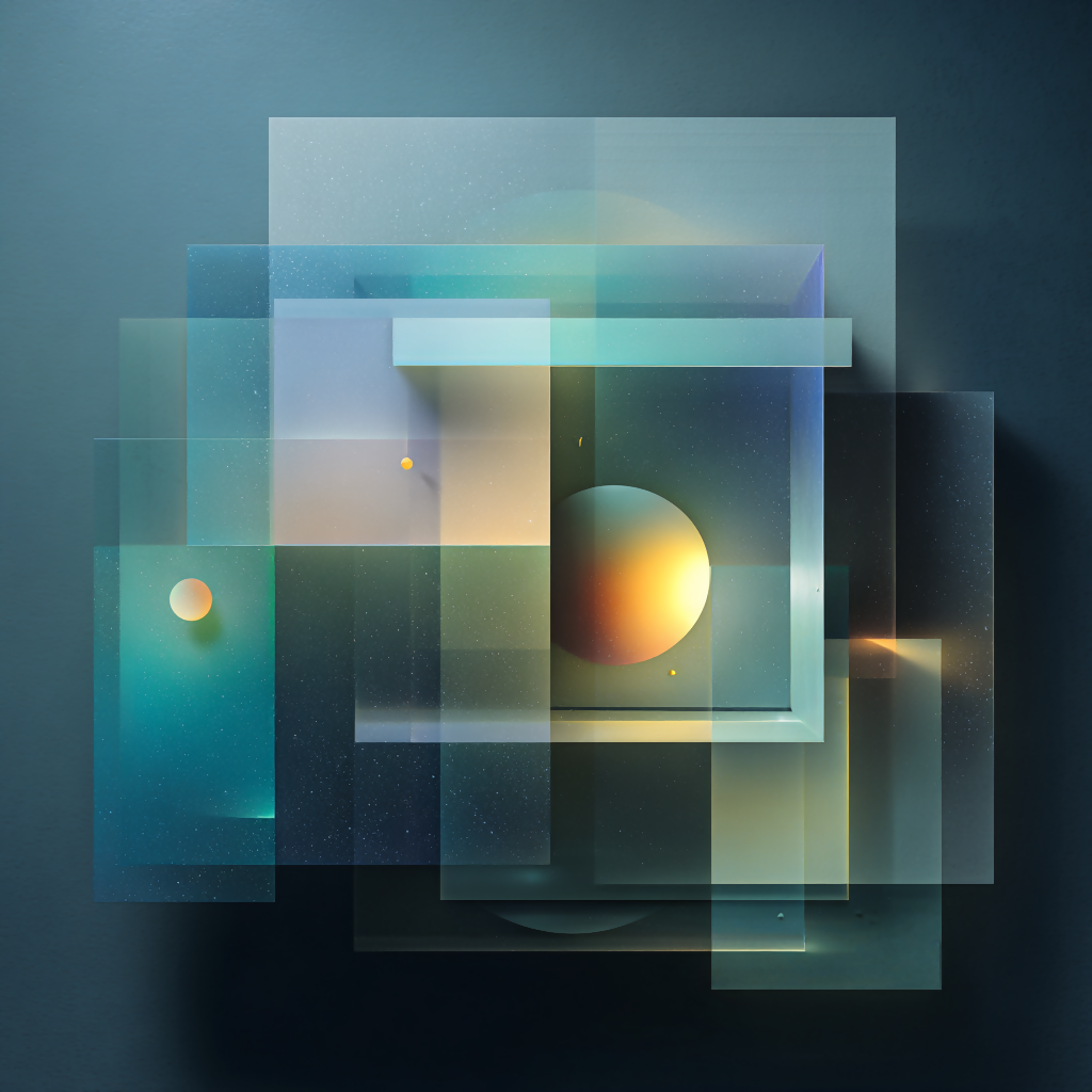 Tags: abstract, digital art, geometric, translucent shapes, glowing spheres, futuristic, 3D render, cosmic, layered composition, virtual space, surreal cityscape