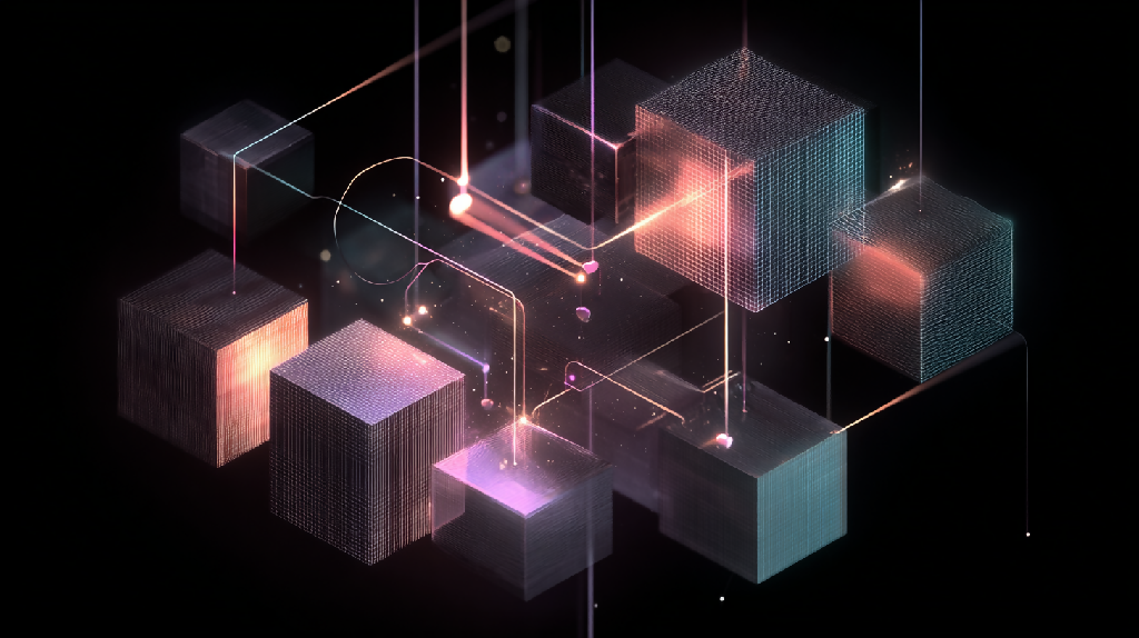 Tags: abstract, digital art, geometric, cubes, data flow, futuristic, 3D render, tech aesthetic, virtual space, glowing lines