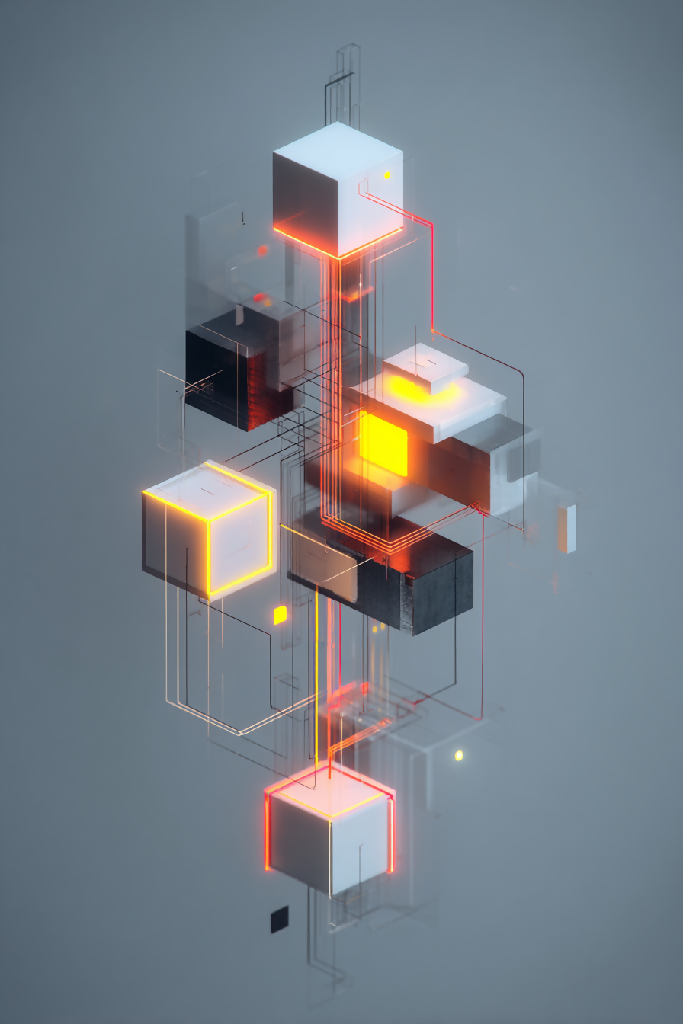 Tags: abstract, digital art, geometric, cubes, data flow, futuristic, 3D render, tech aesthetic, virtual space, glowing lines