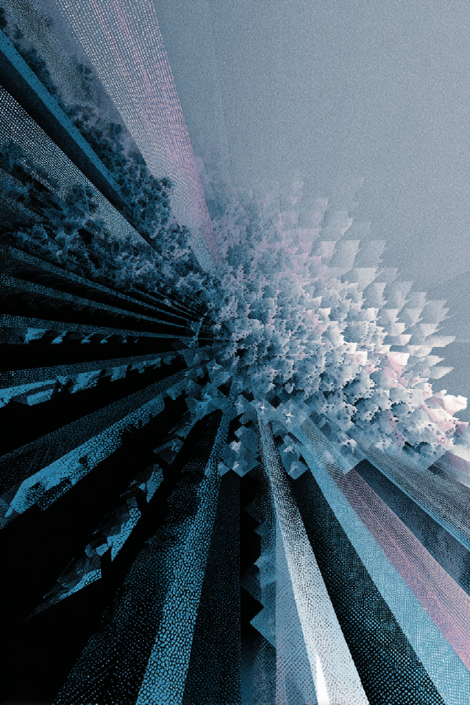 Abstract Dimensions is a digital art collection created by artificial intelligence, exploring the interplay between geometry, light, and ethereal atmospheres. Each piece features symmetrical, fluid, structured, or organic compositions with translucent forms that evoke crystals, folds, architectural patterns, or natural motifs. The color palette ranges from cool blues and greens to warm oranges and grays, generating depth, motion, and a sense of suspended contemplation. Ideal for collectors and enthusiasts of contemporary art with a futuristic and meditative edge.
