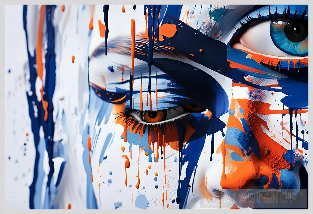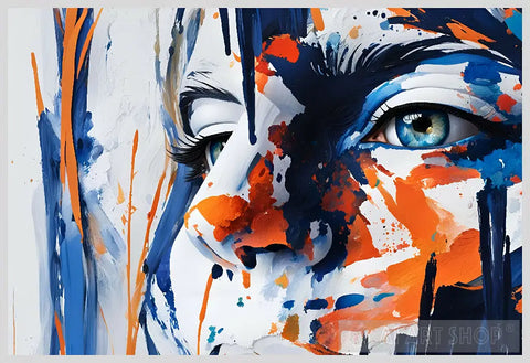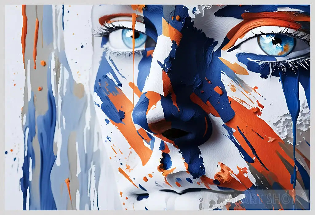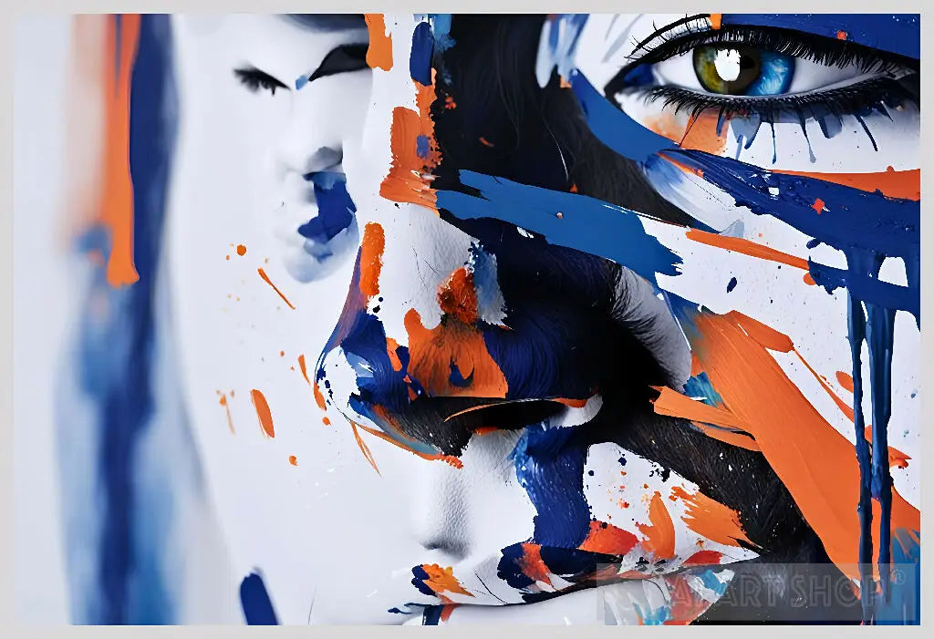 This artwork captures the intensity of human emotion through the interplay of bold, contrasting colors. The vivid blues, fiery oranges, and serene whites coalesce to form a face that embodies both tranquility and passion, inviting viewers to explore the depths of the human psyche and the chaotic beauty within.