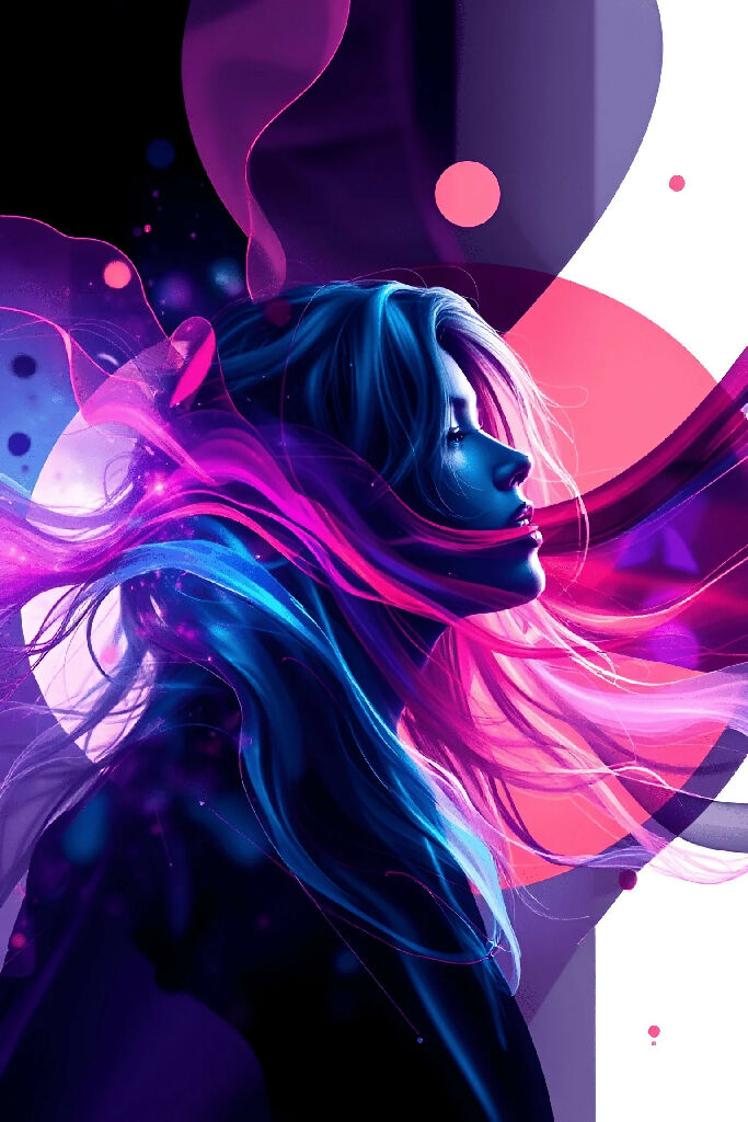 An abstract portrait of a woman showcases vibrant flowing hair in shades of blue and pink, set against a dynamic background of circular patterns. The artwork employs digital illustration techniques, blending colors and shapes to evoke a sense of movement and energy.