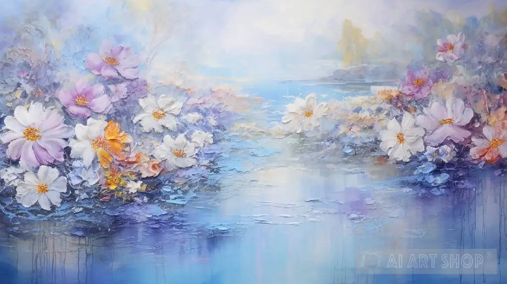 tags: Abstract oil painting,Monet-inspired artwork,Vibrant colors,Water lilies pond,Tranquil atmosphere,Colorful garden scene,Expressive brushwork,Serene composition,Claude Monet style