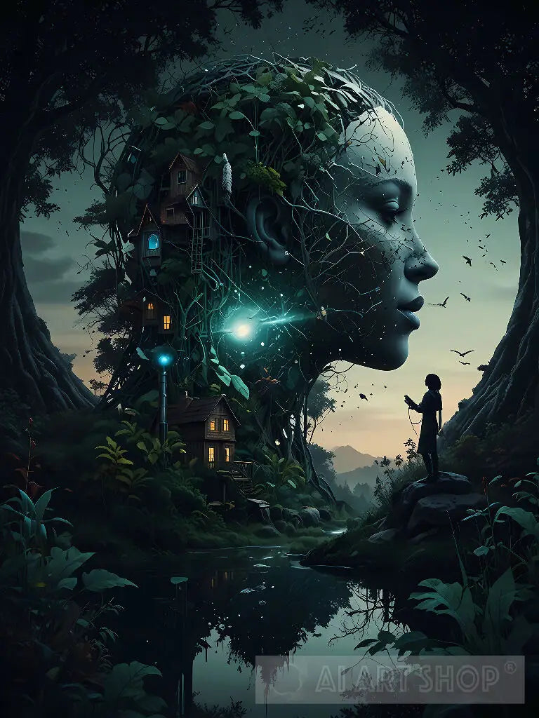 Abstract house in the shape of a woman's head in the middle of the forest. Silhouette of a girl by the river, post-apocalyptic.