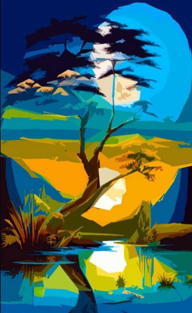 The image is an abstract painting depicting a landscape with a prominent tree in the foreground. The tree has a twisted trunk and branches that extend upwards, partially obscuring a large, bright moon in the background. The scene is rendered in bold, vibrant colors, including shades of blue, green, yellow, and orange. The reflection of the moon and tree can be seen in a body of water at the bottom of the image. The use of geometric shapes and contrasting colors creates a visually striking and dynamic composition, making the image an intriguing piece of modern abstract art.