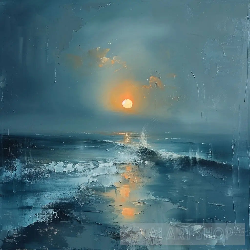 A serene beach during a lunar eclipse, depicted with abstract expressionist strokes in soft blues, pale yellows, and muted grays.