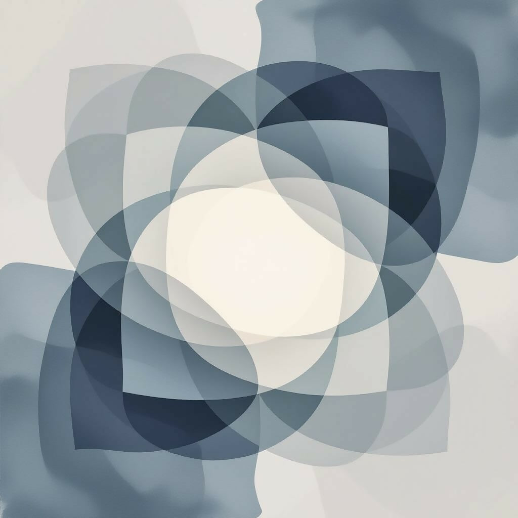This image features soft, swirling mist-like shapes in shades of gray, midnight blue, and ivory with layered gradients and a subtle glow, evoking a dreamlike calm.
