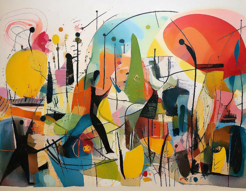This vibrant painting evokes a sense of movement and interaction, as if capturing a moment of energy within a surreal, abstract world. A whimsical abstract landscape; composed of floating geometric and organic shapes. The bold use of colour and dynamic lines creates a feeling of orchestrated frenzy, suggesting themes of harmony, connection, and spontaneity. It is an interplay of energetic movement and structured chaos.