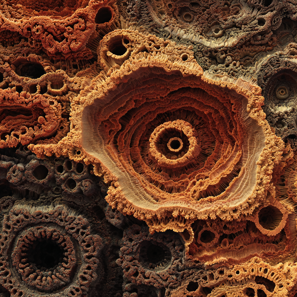 Tags: fractal art, organic patterns, abstract nature, geological textures, coral structures, radial symmetry, earthy tones, digital design, biomorphic, natural geometry
