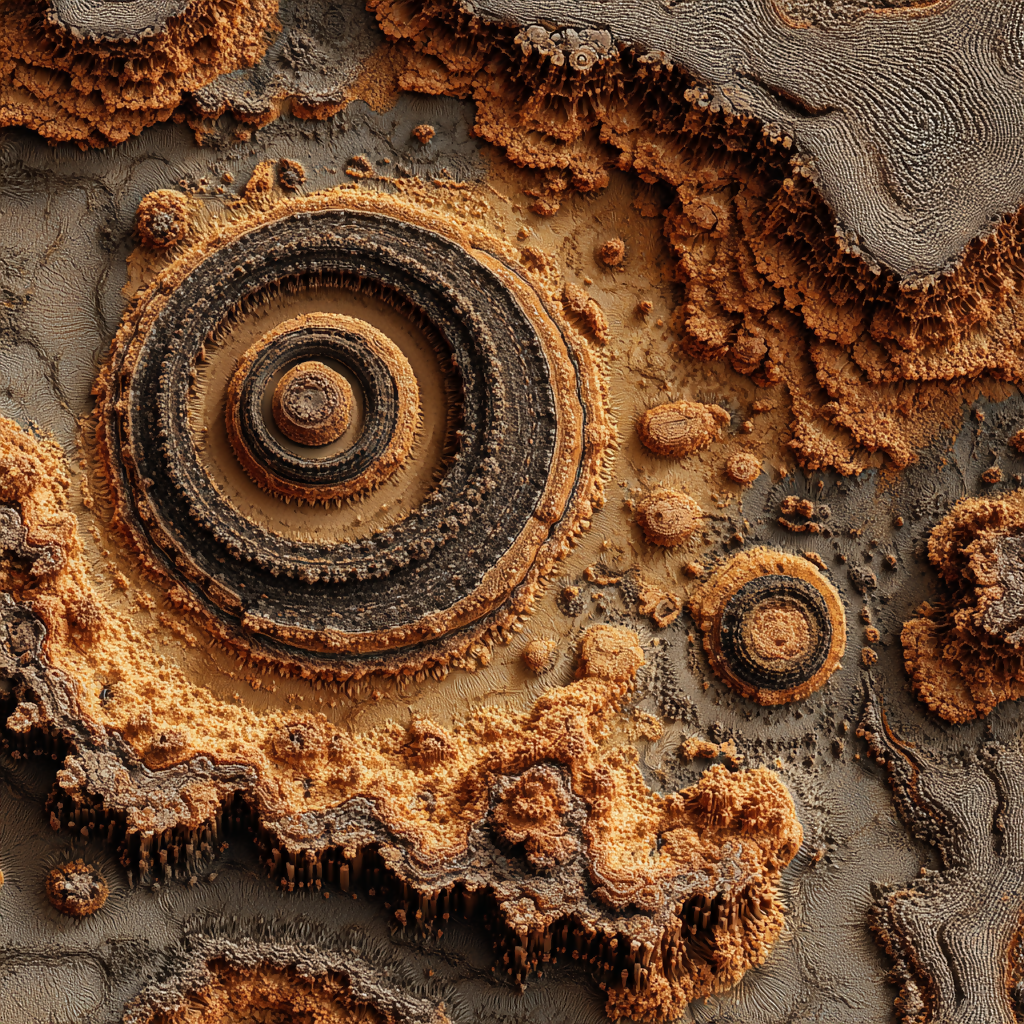 Tags: fractal art, organic patterns, abstract nature, geological textures, coral structures, radial symmetry, earthy tones, digital design, biomorphic, natural geometry