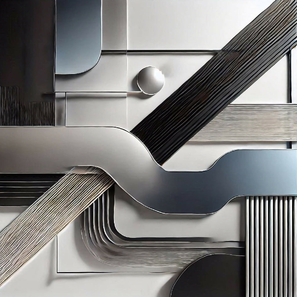 A 3D abstract painting with a minimalist and purist design, featuring elegant black, gray, silver, and blue colors. The composition is sleek and sophisticated, with clean lines and a modern aesthetic.