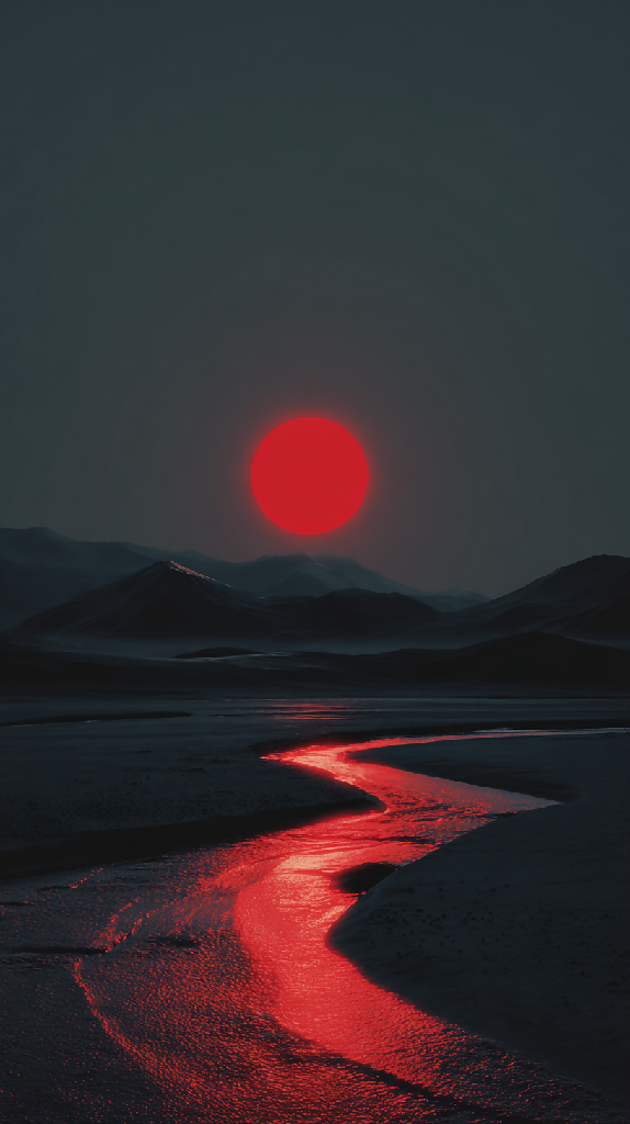 Tags: surreal landscape, red sun, glowing river, dramatic lighting, abstract nature, eclipse, alien terrain, moody atmosphere, digital art, fantasy