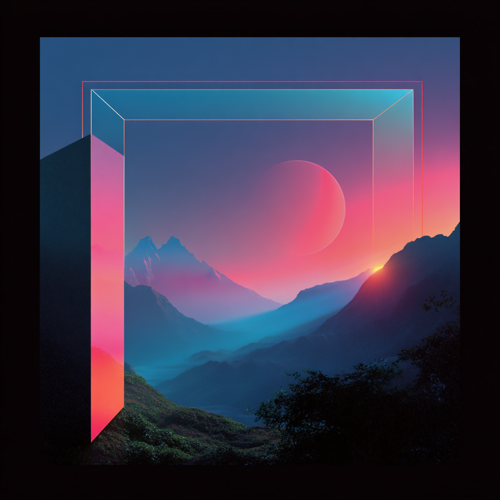 Abstract Refractions is a digital art series exploring the fusion of geometry, light, and surreal landscapes. Each composition features translucent shapes—spheres, rectangles, angular forms—interacting with stylized natural elements like mountains and celestial bodies. Through gradients, reflections, and layered depth, the series evokes a futuristic calm where abstraction becomes a language of perception and emotion.