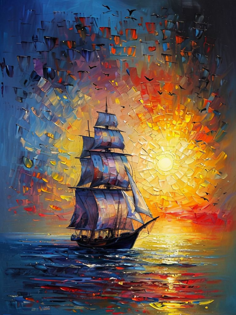 A vibrant and colorful digital painting depicting a sailboat sailing towards a setting sun. The sky is ablaze with warm hues of orange, yellow, and pink, while the sea below is a deep blue. The sailboat is the focal point of the painting, with its sails billowing in the wind. The artist has used a variety of brushstrokes to create a sense of movement and energy, capturing the beauty and tranquility of the scene.