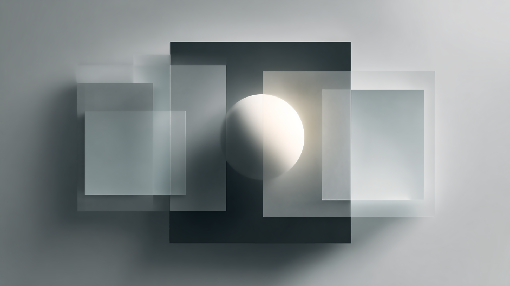 Tags: abstract, digital art, geometric, minimalism, translucent layers, glowing sphere, depth, symmetry, modern design, light and shadow